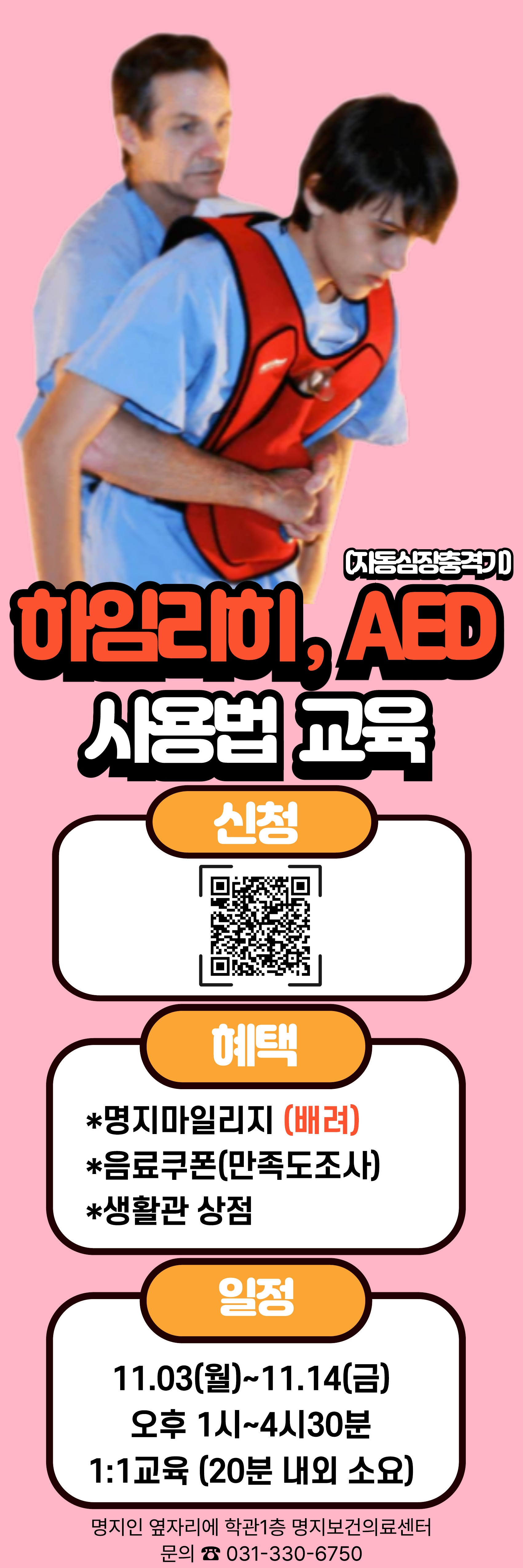 자연보건의료센터에서는 2025-2학기 "하임리히법(목에 뭔가 걸렸을 때) 및 AED 사용법" 교육을 다음과 같이 실시하오니 많은 참여 바랍니다.