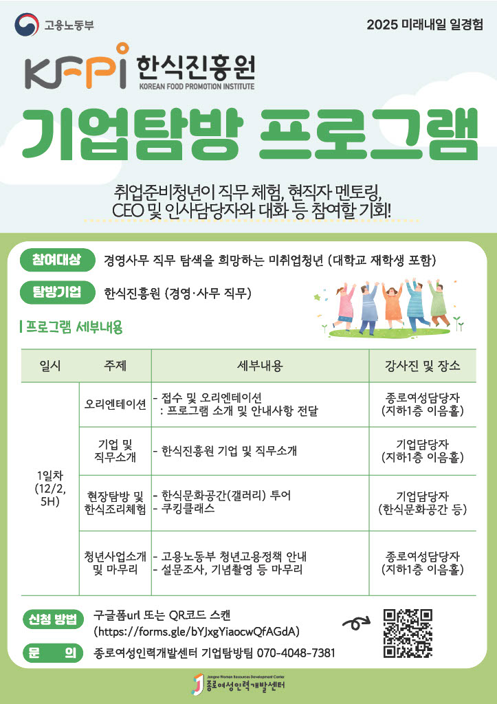 종로여성인력개발센터에서는 "한식진흥원"에서의 직무 체험, 현직자 멘토링,
