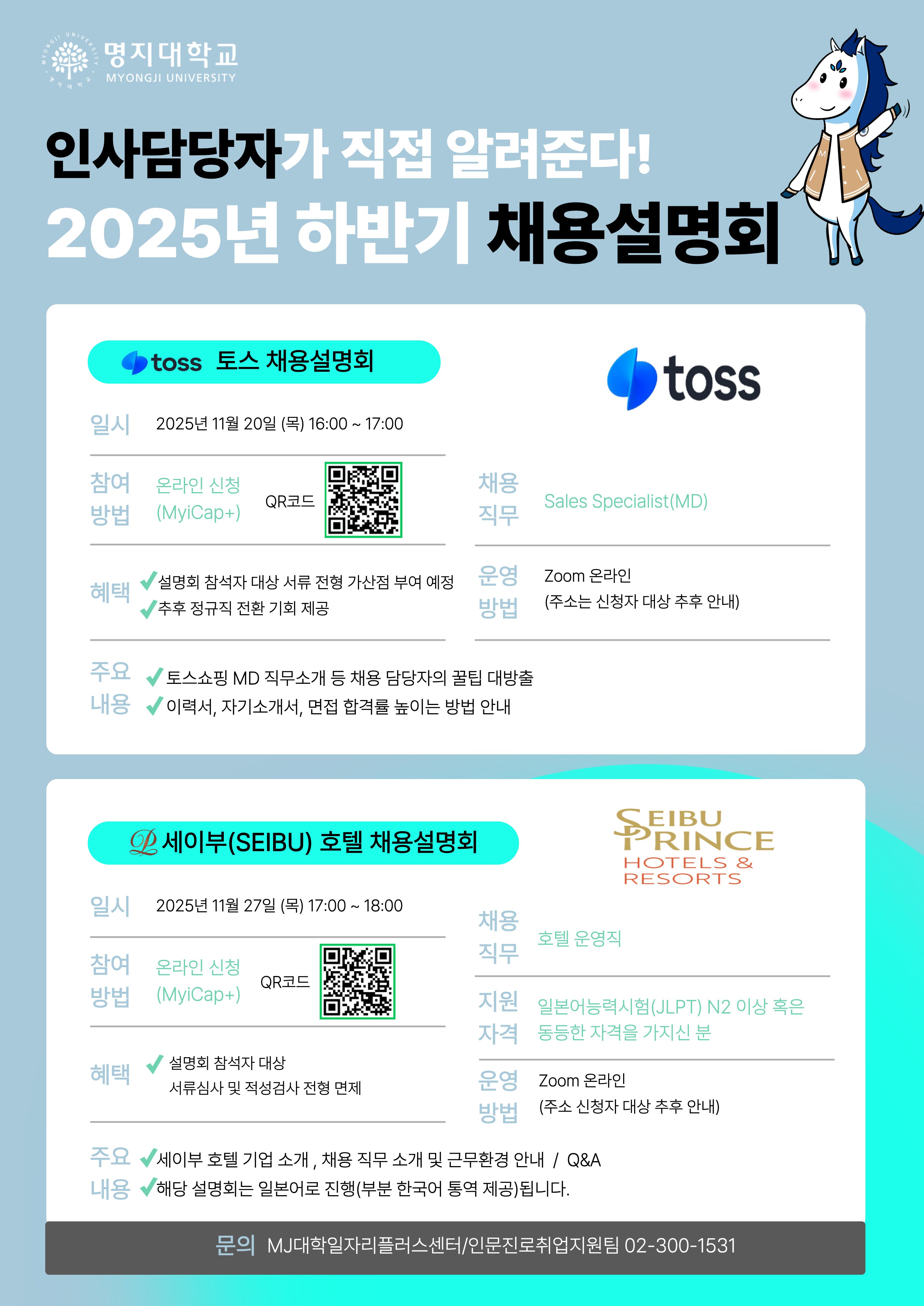 [MJ대학일자리플러스센터] 2025년 하반기 온라인 채용설명회(토스, 세이부호텔)