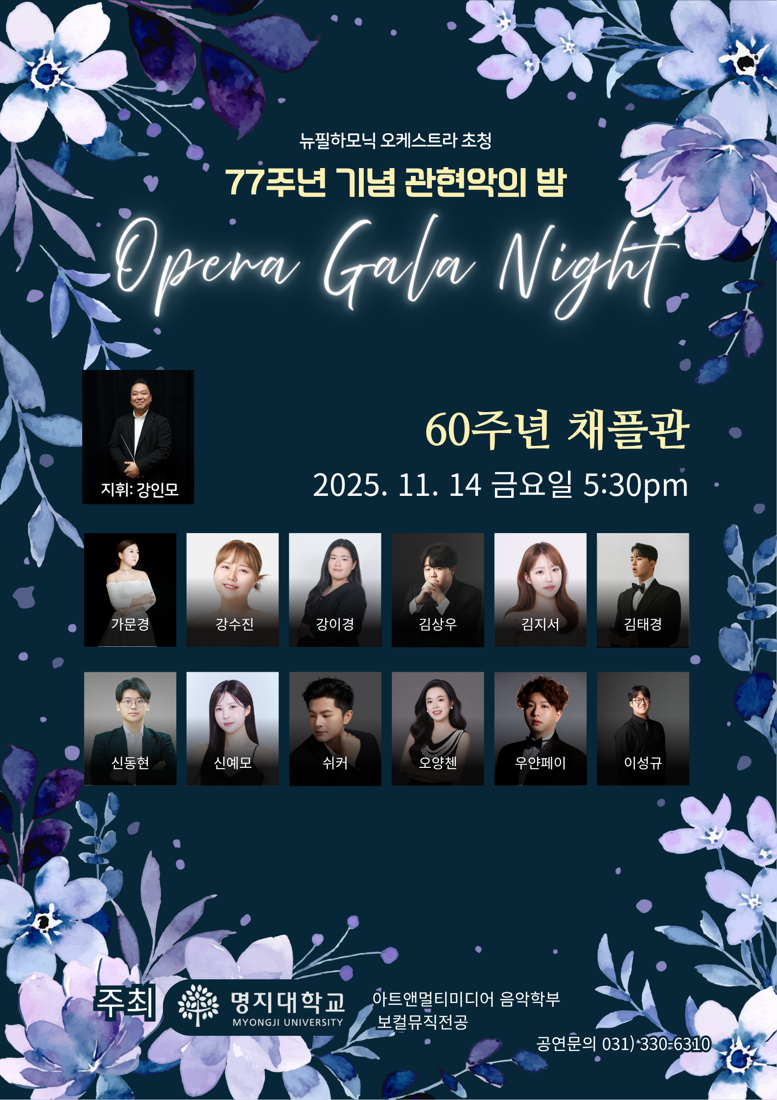 이번 관현악의밤 행사는 아트앤멀티미디어음악학부 보컬뮤직전공 학생들이 그동안 갈고닦은 기량을 선보이는 무대로, 클래식 성악곡부터 오페라 아리아, 가곡에 이르기까지 다채로운 프로그램으로 구성되어 있습니다. 각자의 목소리로 전하는 진심 어린 음악이 여러분의 마음을 울릴 수 있기를 바랍니다.